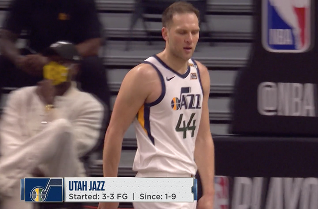 爵士在开场3投3中之后9投只有1中,此时,米切尔一分未得。眼看米切尔被锁死,爵士主帅施耐德也将他提前换下。