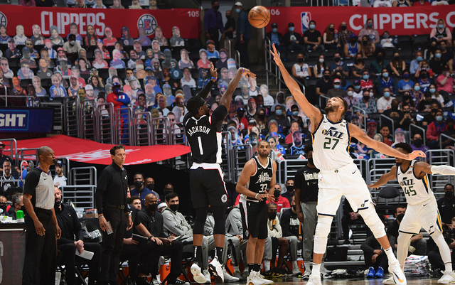 此外,前两场比赛中,快船队的攻筐欲望并不强烈,更多选择是以外线三分投射为主。然而,他们的手感也并不佳,面对联盟的DOPY人物鲁迪-戈贝尔,快船队也许心有惧怕之感。不过,如果他们可以尝试更多地在内线发动进攻,说不定会取得奇效。本场比赛,双方的首发阵容,快船队这边派出的是乔治,伦纳德,小莫里斯,巴图姆和雷吉杰克逊,死亡五小阵容再次登场亮相。爵士队这边派出的是英格尔斯,博格丹诺维奇,奥尼尔,米切尔和戈贝尔。