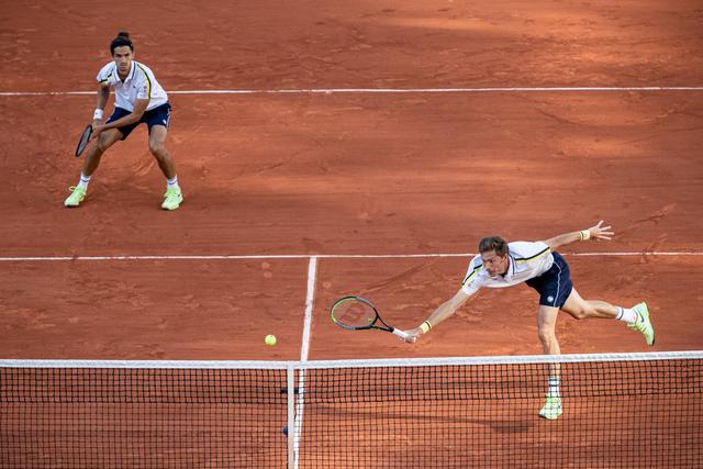 6月12日,法国组合埃贝尔(左)/马于在比赛中。新华社发(奥雷利安·莫里萨尔摄)