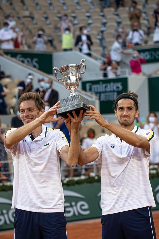 6月12日,法国组合埃贝尔(右)/马于与奖杯合影。新华社发(奥雷利安·莫里萨尔摄)