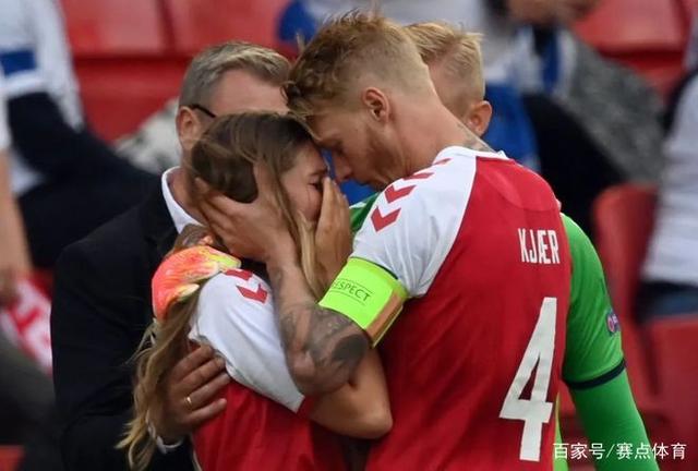 另一边,埃里克森的妻子早已泣不成声,克亚尔和门将小舒梅切尔赶忙跑到她的身旁,用拥抱安慰着。
