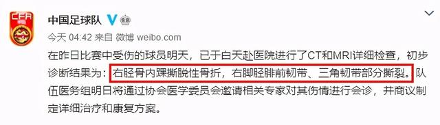 国足主帅李铁在赛后就表示伤情不乐观,随后又有知情记者透露明天基本上无缘最后一轮与叙利亚的关键战,实际上也是给外界提前打了“预防针”。果不其然,国足官方公布了明天的伤情,在经过CT和核磁共振的影像学检查后,初步诊断为右胫骨内踝撕脱性骨折,而且胫腓前韧带和三角韧带部分撕裂,伤势非常严重,铁定缺席了最后一轮比赛。