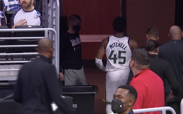 然而第四节还剩6分 的时候,米切尔在一次上篮之后,看起来受伤了。上一场,米切尔跟乔治相撞,不过,赛后他表示,自己很好,还调侃可以做个冲刺跑。