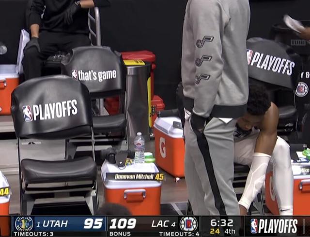 米切尔在比赛还剩6分54秒左右在一次进攻中落地再度扭伤了脚踝,随后他一瘸一拐的回到球员通道,在短暂的治疗后他又回到了板凳席,不过从现场情况来看他依旧一瘸一拐,这场比赛他不会回归了。全场比赛32分钟,24中11,三分9中5拿下30分5篮板4助攻2抢断,米切尔原本就有脚踝伤势,他是一个战士,但他的伤病很有可能会影响本轮系列赛的走势。