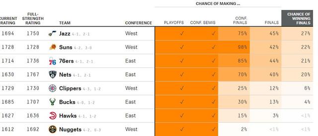 从赛后美媒的预测来看,爵士队晋级西决的概率从82%下滑到了75%,米切尔的伤势的确是一个隐患啊,不过这个概率还是比较稳。