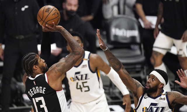 洛杉矶快船在第一节就用伦纳德严防米切尔,这起到了十分不错的效果,米切尔在第一节一分未得,但是即便如此,爵士在第一节也只落后4分。次节比赛归来之后,快船按不住米切尔了,单节狂轰16分的情况下,分差却来到了15分,因为乔治和雷吉的状态实在是太出色了。保罗-乔治单节也有13分2助攻,雷吉-杰克逊再中2记三分球,拿到8分1助攻。