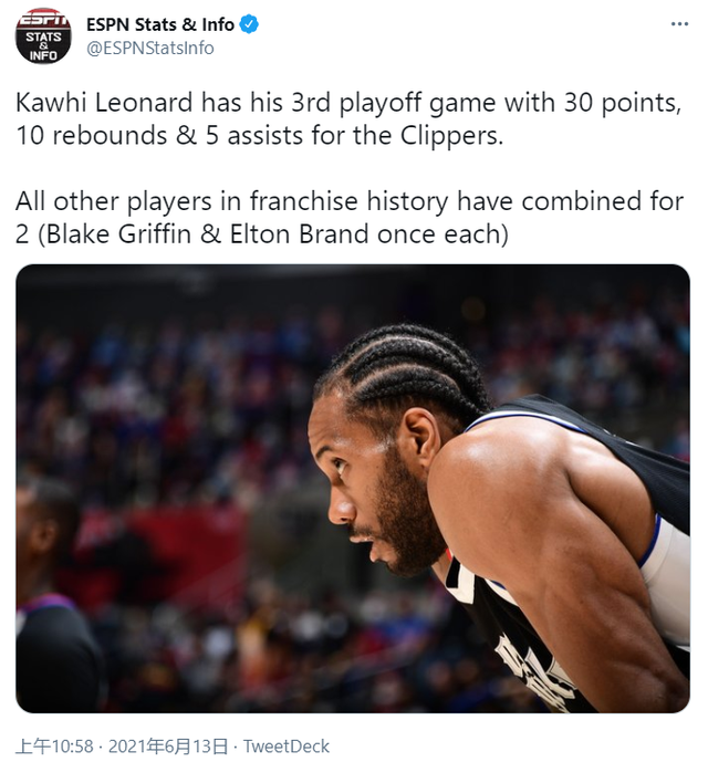 根据赛后统计显示,这是伦纳德快船队生涯,第三次在季后赛交出至少30分+10篮板+5助攻的表现。