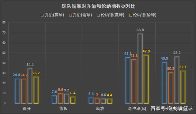 数据是不会说谎的,赢球和输球时,乔治的表现相差不大,基本还是尽到了二当家的职责,但是伦纳德在赢球是表现逆天,输球的时候数据骤降,基本降到了和乔治一个水平,也就是二当家的水平。当一个球队的老大,发挥的水平和二当家差不多的时候,球队输球也就理所应当了。