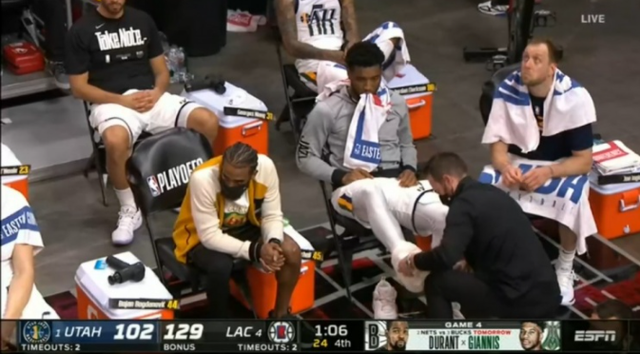 米切尔今天只打了三节半砍下30分5篮板4助攻,算上前2场的45分还有37分,他3场比赛场均轰下37分,风头完全盖过了莱昂纳德跟乔治。但是,上一场比赛最后,米切尔跟乔治相撞,脚部就险些受伤。而今日,米切尔在末节一次上篮落地后,再次感觉到了脚部不适,随后一瘸一拐返回了更衣室,惊出了球迷一身冷汗。尽管比赛结束前米切尔回到了板凳席,但他的右脚踝已经绑着巨厚的冰袋,看起来让人非常揪心。