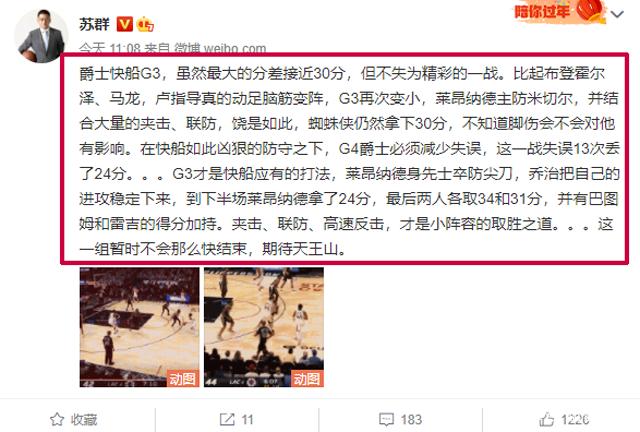 对于这样的比赛,知名篮球评论员苏群,则是点赞了泰伦卢指导,他表示:“爵士快船G3,虽然最大的分差接近30分,但不失为精彩的一战。比起布登霍尔泽、马龙,卢指导真的动足脑筋变阵,G3再次变小,莱昂纳德主防米切尔,并结合大量的夹击、联防,饶是如此,蜘蛛侠仍然拿下30分,不知道脚伤会不会对他有影响。在快船如此凶狠的防守之下,G4爵士必须减少失误,这一战失误13次丢了24分……”