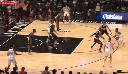 爵士首发阵容相对固定,戈贝尔参与无限换防,踩着三秒区站位,放空弱侧底角埋伏的巴图姆,对快船强侧持球点突破攻筐进行协防;戈贝尔能换防到三分线对位雷吉、小莫里斯、卡哇伊、乔治,边防边退,对快船诸将放投不放突,站定防守位置只以长臂干扰中远投,然后迅速归位保护篮板,爵士诸将力求在防守端将快船阻击在三秒区之外终结进攻。