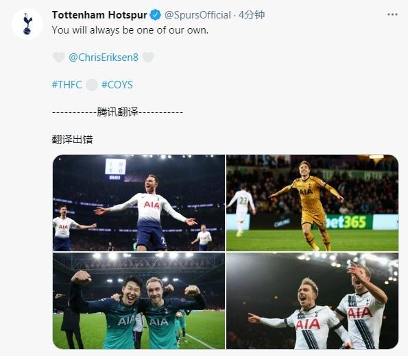 老东家热刺官推今日为球员又送去祝福,发文喊话埃里克森:“你永远是我们的一员”