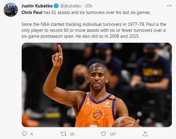 根据数据专家贾斯汀-库伯斯特的统计,保罗过去的六场比赛送出61次助攻+6次失误,自1977-78赛季引入失误以来,保罗是唯一一个季后赛六场比赛中以6次失误或更多失误纪录送出60次+助攻他个的球员,他在2008年与2015年还做到过。这就是控卫之神!