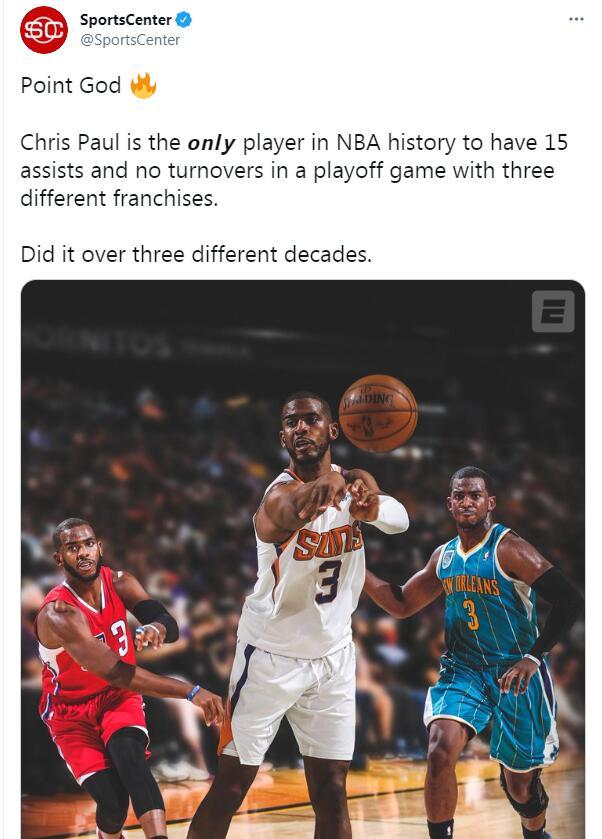 美媒SC盛赞保罗为控卫之神,克里斯-保罗成为NBA历史上唯一一个在三轮不同的系列赛中都有过单场15次助攻+0次失误表现的球员,太阳时期、快船时期、黄蜂时期。