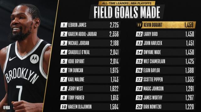 这样一来,杜兰特季后赛运动战进球数来到1459个,超越“神偷”哈弗里切克(1451个)与拉里-伯德(1458个),来到历史第11位。
