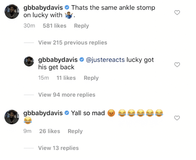 欧文受伤,戴维斯在社媒上评论道:“那就是他踩踏绿军队标的同一个脚踝,lucky(绿军队标)让他付出代价。”戴维斯的言论很快招致球迷的骂声,认为他在幸灾乐祸,戴维斯又发了一条:“你们都疯了!”戴维斯还是看错了,欧文踩队标用的是左脚,而他伤的是右脚。