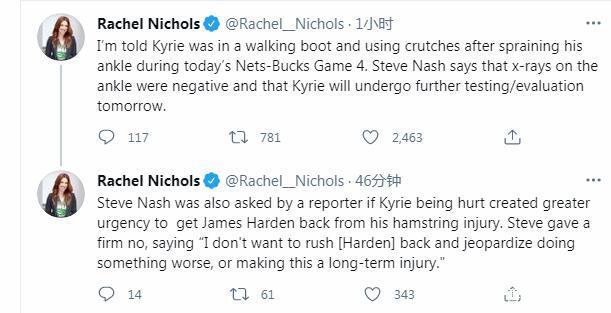 哈登仍受到腿筋伤势困扰,欧文又突然受伤,篮网的夺冠前景蒙上了阴影。第五战是天王山之战,对于篮网和雄鹿都非常关键。当被问到欧文能否参加第五战,纳什表示不清楚。欧文还需要接受进一步检查确定伤情。从常理来看,欧文需要休养一段时间,缺席第五战的可能性比较大。欧文赛后穿上了保护靴,拄上了拐杖。