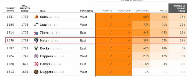 美媒fivethirtyeight更新了最新晋级概率,篮网下降到58%,雄鹿为42%。篮网夺冠概率下降到17%排名第四,前面有太阳、爵士、费城队。哈登和欧文的伤情成为左右这轮系列赛的关键因素。