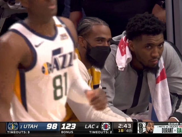 第四节比赛,爵士试图发起反击,但是快船每次都给予有力的回击,比赛还剩下7分钟的时候,米切尔再一次上篮后好像扭伤了脚踝,随后受伤返回更衣室,而小卡强势打成2+1,一分钟后,米切尔系好鞋带准备重新返回场边,但是快船这边进攻的火力已经彻底按不住了。