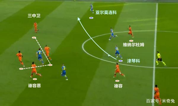 乌克兰也会不自觉地被吸引防守兵力,加上中路维纳尔杜姆和韦格霍斯特的要位,就让后点邓弗里斯被完全放空。