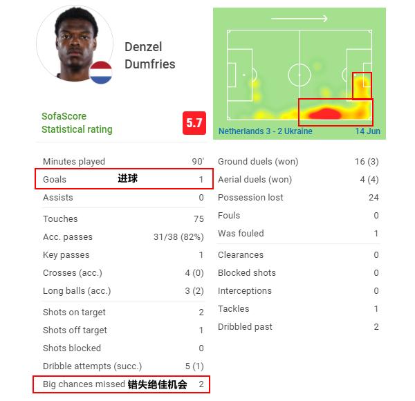 邓弗里斯是荷兰3个进球的最大功臣,同时打入1球的他,还错失了2次绝佳机会,否则还会更加亮眼。