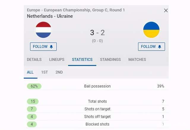 但是在射正数上,荷兰只是7-5稍稍领先,乌克兰人打出一波高潮几乎逆转比赛。