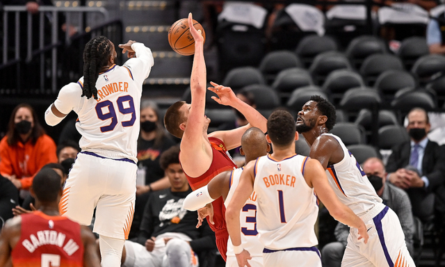 面对克里斯-保罗无解的中距离跳投,约基奇罕见失去理智,一个抢球动作拍倒了佩恩,布克为队友出头领到了技术犯规,而约基奇更是直接被驱逐出场,令人费解。约基奇下场之后,太阳一度取得了16分的领先优势,不过掘金队展现了他们的韧性,将分差缩小到13分。末节归来之后,掘金队全民皆兵,一次又一次地缩小分差,但克里斯-保罗似乎拥有一种神奇的魔法。