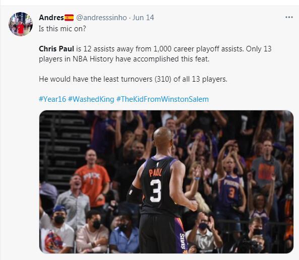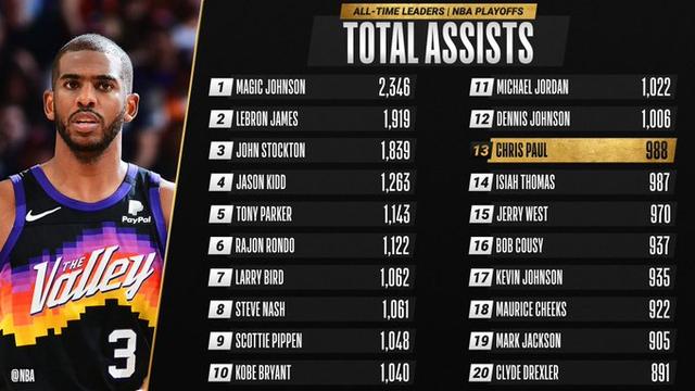 除此之外保罗在季后赛的助攻数也突破了988次升至历史第13位。