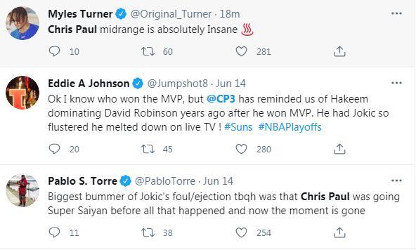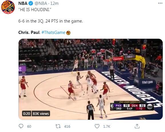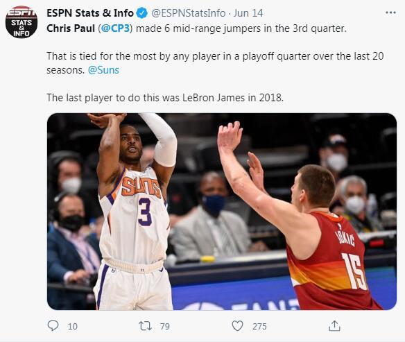 根据ESPN的统计,保罗在第三节中距离6中6,是过去20个赛季的季后赛半决赛中得分最多的一次,排在第二的是2018年的勒布朗-詹姆斯。