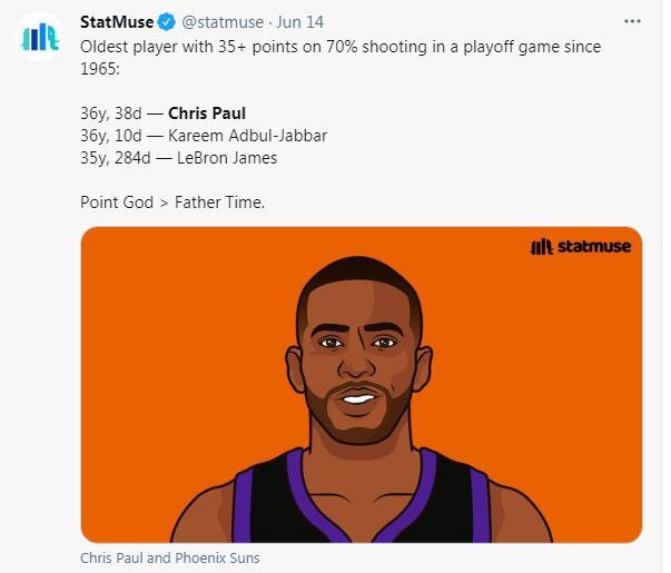 保罗的第五个纪录,他拿下35分而且命中率在70%以上,他成为1965年以来年轻最大的球员,36岁零38天,排在第二的是贾巴尔36岁10天,第三是詹姆斯35岁284天。再度盛赞他是控卫之神。