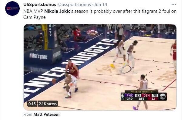 北京时间6月14日,太阳125-118以击败掘金完成4-0横扫,这场比赛在第三节还剩3分52秒时就结束了,因为MVP吃下二级恶意犯规被驱逐出场,当约基奇被驱逐了掘金根本无力回天了,原本两队都还在僵持,只可惜约基奇头脑发热打到了佩恩的头部让比赛早早失去了悬念。