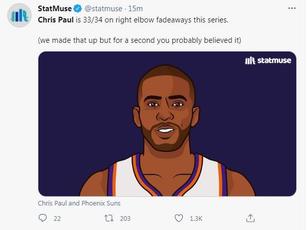 比赛还没打完,数据媒体StatMuse就晒出一组数据,在这轮系列赛中保罗在右侧中距离是34中33,这是多么可怕的数据啊,这一数据真的是令人咋舌。