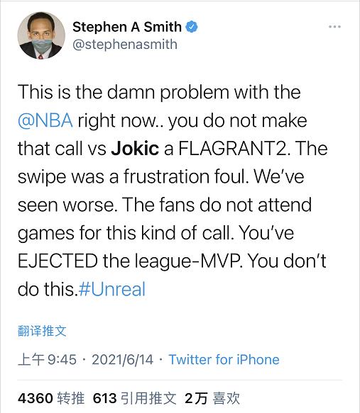 由于击打到了面部,所以裁判还是通过录像回放之后再做出最终的判罚,裁判回看之后,对约基奇吹罚了二级恶意犯规,直接驱逐出场。