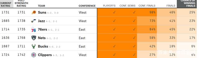 随着太阳队的出色表现,美媒权威网站也针对太阳队进行了预测,最终太阳25%,爵士23%,76人22%,篮网17%,雄鹿6%,快船6%的夺冠概率。太阳队力压群雄成为了当下夺冠的最大热门。