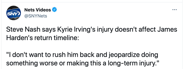 但目前篮网所面临的伤病问题并不仅如此,因为另一名超级巨星球员詹姆斯-哈登也身处伤病康复阶段。那么在欧文受伤后哈登有尽快复出的可能性?