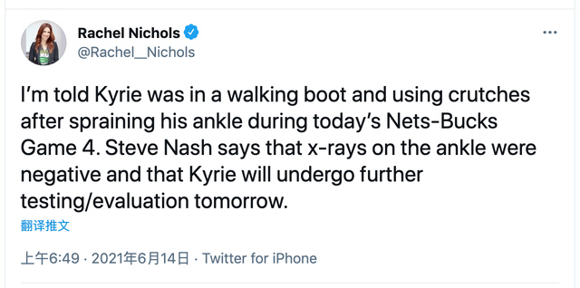 另外据报道,目前欧文已经穿上保护靴和用上拐杖,所以就目前情况来看,欧文似乎不太可能在短期内的恢复健康。简单来说,笔者估计遭受脚踝伤病的欧文很难为篮网出战接下来的天王山之战。