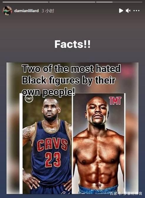 日前,开拓者球星利拉德更新个人Ins,转发了一张湖人球星詹姆斯和拳王梅威瑟的照片。图片配文说道:“两个最令黑人仇恨的自己人。”利拉德转发配文说道:“事实。”