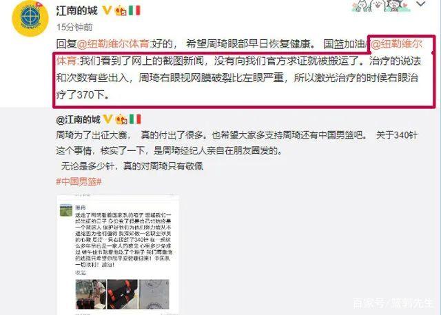 之后,周琦的经纪公司透露,“治疗的说法和次数有些出入,周琦右眼视网膜破裂比左眼严重,所以激光治疗的时候右眼治疗了370下。”是370,不是340,是下,不是针。这样一来,真相也是水落石出了。作为球迷,对此也是可以理解了。