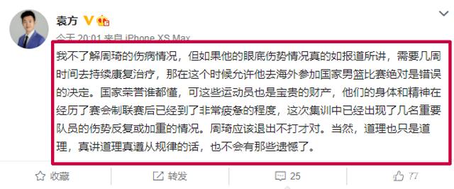 手术结束,立马前往赛区。这样的周琦,在获得点赞的同时,也获得很多的祝福与建议。比如,名记袁方就在网络上表示:“我不了解周琦的伤病情况,但如果他的眼底伤势情况真的如报道所讲,需要几周时间去持续康复治疗,那在这个时候允许他去海外参加国家男篮比赛绝对是错误的决定。国家荣誉谁都懂,可这些运动员也是宝贵的财产,他们的身体和精神在经历了赛会制联赛后已经到了非常疲惫的程度,这次集训中已经出现了几名重要队员的伤势反复或加重的情况。周琦应该退出不打才对。当然,道理也只是道理,真讲道理真遵从规律的话,也不会有那些遗憾了。”
