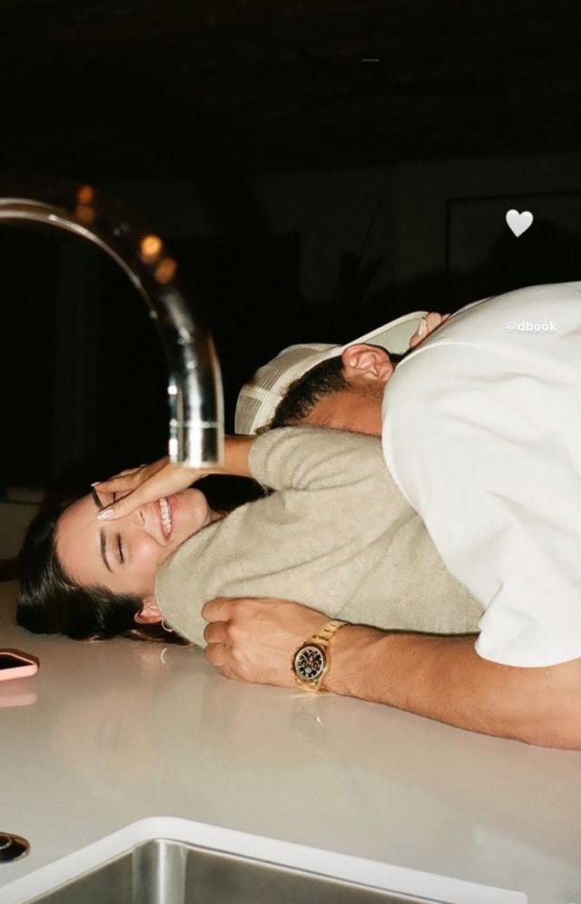 恋爱的两个人在哪里都很甜蜜,布克将詹娜扑倒在一个厨房的厨具上,还顽皮地将脸埋进女友怀里,詹娜则没有拒绝,一脸幸福的笑容。