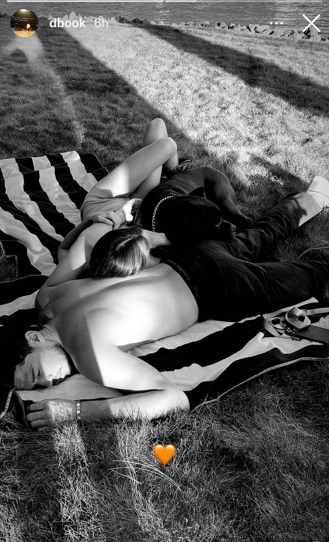 二人一起在海边玩“漂浮”,鸳鸯戏水,虽然镜头离着有些远,但是依然可以看出二人的身材都非常好,而在湖边的草地上,两个人衣着清凉,詹娜和一只黑色宠物狗都压在了布克身上。