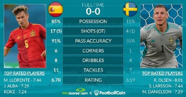 全场比赛下来,西班牙 17 次射门 5 次射正,瑞典 4 次射门 1 次射正。西班牙有 6 次角球,瑞典只有 1 次角球。西班牙全场比赛 8 次成功过人,瑞典有 4 次成功过人。