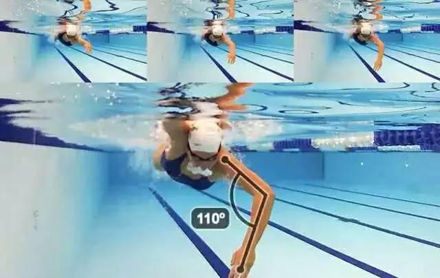 划水是获得推进力的主要阶段,以肩为界划水分为两部分,肩前划水称为“拉水”,肩后划水称为“推水”。拉水时,肘关节弯曲的程度逐渐加大,手臂保持高肘姿势,加速沿向后、向内和向上的方向划动。当臂划至肩下方时,手在身体的下方靠近身体中线,手臂与水平面垂直,手掌向后,肘向外,屈肘成90°至120°手臂划过肩的垂直面,划水转入推水阶段。推水时应尽量使前臂和手以最大面积向后对准水,手臂一边沿向后、向上和向外的运动方向推水,一边逐渐伸肘和伸腕,当手臂向后推水至大腿旁,与水平面约成20°角时,推水结束。