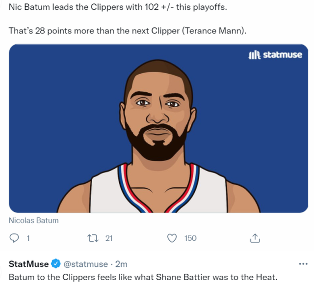除了曼恩的表现出色之外,巴图姆在季后赛中,他的正负值高达+102,这也是全队最高的正负值,甚至比排名第二的曼恩还多了28。因此,美媒也点评称:“巴图姆在快船的角色,就像是当年肖恩-巴蒂尔在热火时一样。”