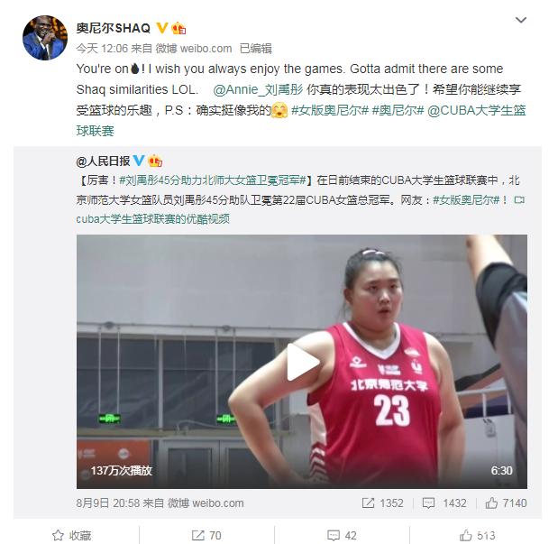 越来越多球迷开始关注这位“女版奥尼尔”,其呼声之高,甚至惊动了大洋彼岸的大鲨鱼,他在看过刘禹彤的比赛集锦后点赞并配文:“打得真好,确实像我。”
