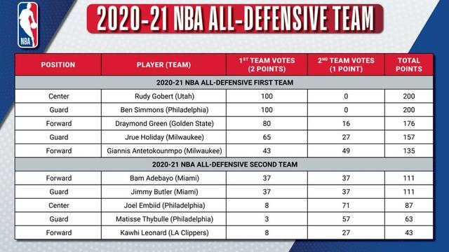 NBA今天官方公布了2020-21赛季最佳防守阵容的评选结果,入选最佳防守一阵的分别是:扬尼斯-阿德托昆博、鲁迪-戈贝尔、德雷蒙德-格林、朱-霍勒迪以及本-西蒙斯。