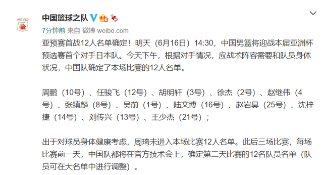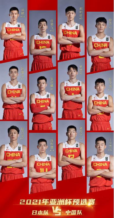 中国男篮的官方消息显示,第一场对阵日本的12人名单如下: