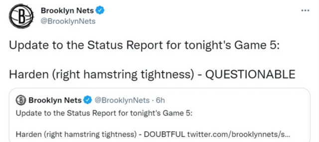 不过,哈登腿筋紧张的伤势确实有了很大的改善,篮网在前一天将哈登列为OUT,但是仅仅几个小时过去,哈登的出战状态由小概率出战变成上场概率25%,接着又从25%出战,变成50%。篮网接连更新哈登的出战状态,也代表哈登的伤情局势越来越乐观。无疑,哈登的回归将会给篮网、杜兰特、外线的射手群吃了一剂定心丸。