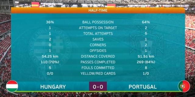直播吧6月16日讯 欧洲杯F组第一轮,葡萄牙VS匈牙利。半场比赛结束,葡萄牙暂0-0匈牙利。半场数据葡萄牙控球率64%,射门比5:1