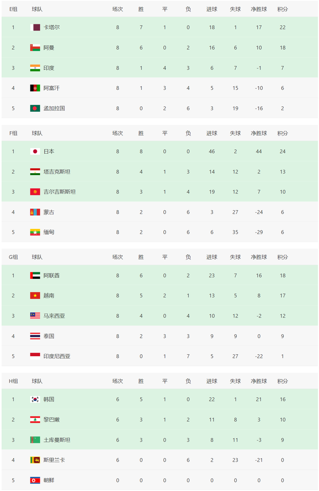 日本队8战全胜,共打进46球,场均进球接近6个,总进球数高居40强赛各队进球榜榜首;日本队8场比赛仅丢2球,后防表现亦非常出色。本组日本队表现太过强势,其他球队皆被全面压制,塔吉克斯坦最终排名小组第二,去掉与垫底队战绩之后净胜球不够数,最终无缘12强。